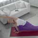 Bald yogis shifting from warrior pose to revolved triangle pose
