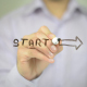 Man, Businessman, entrepreneur, stock trader, analyst or banker writes on transparent wall : Start