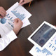 Above view dolly shot of graphic data templates on long table with unrecognizable business people analyzing them