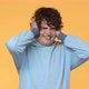 Stop please. Slow-motion fed up. distressed and depressed curly teen guy, shaking head in denial, close ears, holding hands on head, cringe upset, cant bear terrible noise anymore, hear awful sound.