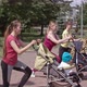 Women pushing strollers with kids and squatting with lifting leg backward during exercising in the park, sport training for parents outdoors
