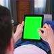Student boy Resting on a Couch Using with Green Mock-up Screen Tablet Computerin Vertical Portrait Mode. Man Using Gestures with Touchscreen Device, Browsing Internet, Watching Content.