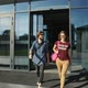 Joyful, intelligent students going home after classes, coming out of new, glass building, outdoor shot near modern european university on friday afternoon