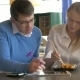 Two students are sitting in cafe. They are dining, discussing the study project and making notes in tablet PC.