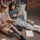 Study process. Couple of young groupmates reading books at library, preparing for exam together, sitting on floor, tracking shot, slow motion, free space