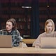 Study process. Portrait of two young students studying together at campus library, typing on laptops, free space