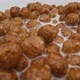 Chocolate flakes are poured with milk. super close up. milk is poured into breakfast cereals chocolate corn balls. Milk pouring into bowl with chocolate balls.