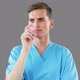 Surgeon using digital screen against grey background