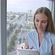 Zoom out shot of young woman sitting by large window in office and using tablet computer for work