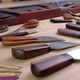 Tanner or leather craft tools. Close up of different tanner tools lying on wooden table. Different knifes and awls hand made. Dolly or slider shot.