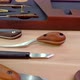 Tanner tools. Close up of different tanner tools lying on wooden table. Different knifes and awls hand made. Dolly or slider shot.