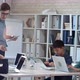 Young male teacher walking in classroom and checking each student’s progress while they are doing task on laptop computers