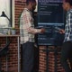 Team of software engineers leaving after analyzing source code on wall screen tv comparing errors using digital tablet. Coders passing coworker programmer writing code for artificial intelligence.