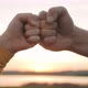 Teamwork concept. Hands of child and adult male show strength teamwork at sunset. Two holding hands. Successful team.