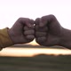 Teamwork concept. Hands of child and adult male show strength teamwork at sunset. Two holding hands. Successful team.