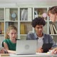 Tracking left of five students sitting at long desk at computers, using them while teacher going along classroom and checking their work