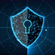 Internet technology cyber security concept of protect and scan computer virus attack with Shield icon on digital blue realistic radar with targets on monitor in searching background.