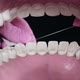 Teeth cleaning thread. Daily dental healthcare. Brushing teeth with dental floss shown on plastic model. Teeth flossing. Orthodontist showing how to clean teeth using floss and jaw model. Dental oral hygiene. 4 k