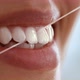 Teeth flossing. Close up shot of unrecognizable woman cleaning deeply her white perfect teeth with tooth floss, slow motion, empty space