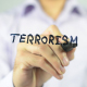 Young Man, Businessman, entrepreneur, creative designer, freelancer writes and draws on transparent wall : Terrorism