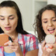 Tilt up of girls having fun during making up, one correcting lip gloss of the other