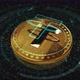 Tether USDT stablecoin cryptocurrency golden coin turning. camera rotates around the 3D metal glow coins. Fintech, online payment and digital transaction abstract concept.