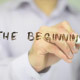 Man, Businessman, entrepreneur, stock trader, analyst or banker writes on transparent wall : The Beginning