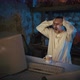 The computer nerd got scared by what he saw on the monitor. Video conference in group virtual chat. A funny programmer with a mustache and stupid glasses in an old garage. Distance learning, teamwork