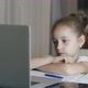Children at home, family education, children education concept. Younger student sits at home at the computer, studies, listens to school lectures, and does his homework at home.