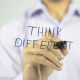 Man, Businessman, entrepreneur, creative designer, stock trader, analyst or banker writes on transparent wall : Think different, Creative