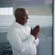 Thinking Process. Pensive Black Male Entrepreneur Rubbing Hands While Standing In Modern Business Center, Thoughtful African American Businessman Comparing Ideas In His Head, Slow Motion Footage