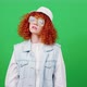 Thinking process. Young pensive redhead curly woman wearing panama hat and glasses brainstorming, looking at camera over green chroma key studio background