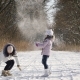 Mother and daughter, joyfully throwing snow at each other while standing on a snow-covered road through the forest in winter frosty sunny day. Slow motion.