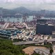Timelapse wide Hong Kong overpass highway with interchange at container terminal and industrial constructions against hills and city silhouette zoom out