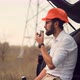Tired Worker Ond End Working Day.Investor On Build Object.Electrical Engineer In Helmet On Power Lines.Technician With White Helmet Relaxing After Hard Job.Investor Engineer With Hardhat Drinking Tea.
