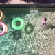 A drone shows kids playing in a backyard pool having fun on summer vacation.