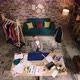 A man is in a very comfy and well decorated home office, he is playing around with an airplane while sitting at his desk and continuing on with his designer work on a piece of blue fabric, the atmosphere is very lively and motivated