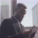 Portrait of young confident african-american businessman riding in modern glass elevator with digital tablet. Corporate communications outside office