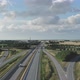 Daytime view in aerial hyperlapse mode of a highway with fluffy white clouds in the sky.