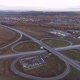 Aerial view of a freeway intersection. Cars driving on the highway. Narby industrial buildings and residential area. Autumn day. There is a forest on the horizon. Leaves and grass began to turn yellow. 14