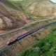 A passenger train pulled by train passing through countryside. The train travels through the spring. View through the windshield from the driver’s seat. Rails ahead. Beauty world, travel lifestyle, holidays and recreation.