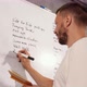 Training course. Athlete writes down schedule, number of exercises to organize physical exercises, classes with marker on white board, training fitness, training class, classroom
