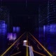 Traveling in a virtual world. A road looking like a circuit board is guiding us through. A bright light appears in the middle of the path and forms a projection of the word Upload. 3D environment.
