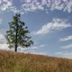 Time lapse video of Clouds moving over alone beech tree in sunny day with clouds moving over blue sky and meadow.