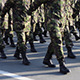 Soldiers in camouflage uniform and wearing boots are marching in cadence.