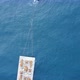 Tugboat pulling a large barge carrying components of a artificial reef structure. Drone view looking down