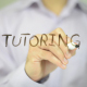 Man, teacher, student, professor writes on transparent wall : Tutoring