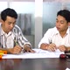Two Asian Architects Discussing With Blueprints, video in 4k.