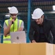 Two factory workers working and discussing manufacturing plan in the factory . Industry and engineering concept .