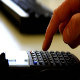 Timelapse with low FPS to create fast, nervous typing on the small calculator on the table. Close up clip, showing fingers typing on the calculator. Office clip.